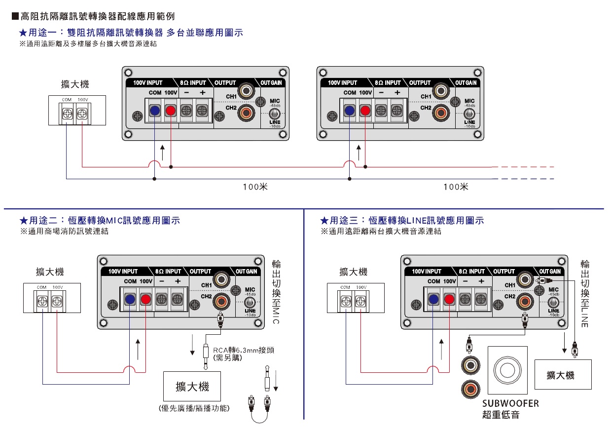 | 輸入訊號 | 恆壓高阻抗70V~100V或低阻抗4-8Ω喇叭訊號 ※只能選一種作為訊號輸入 |