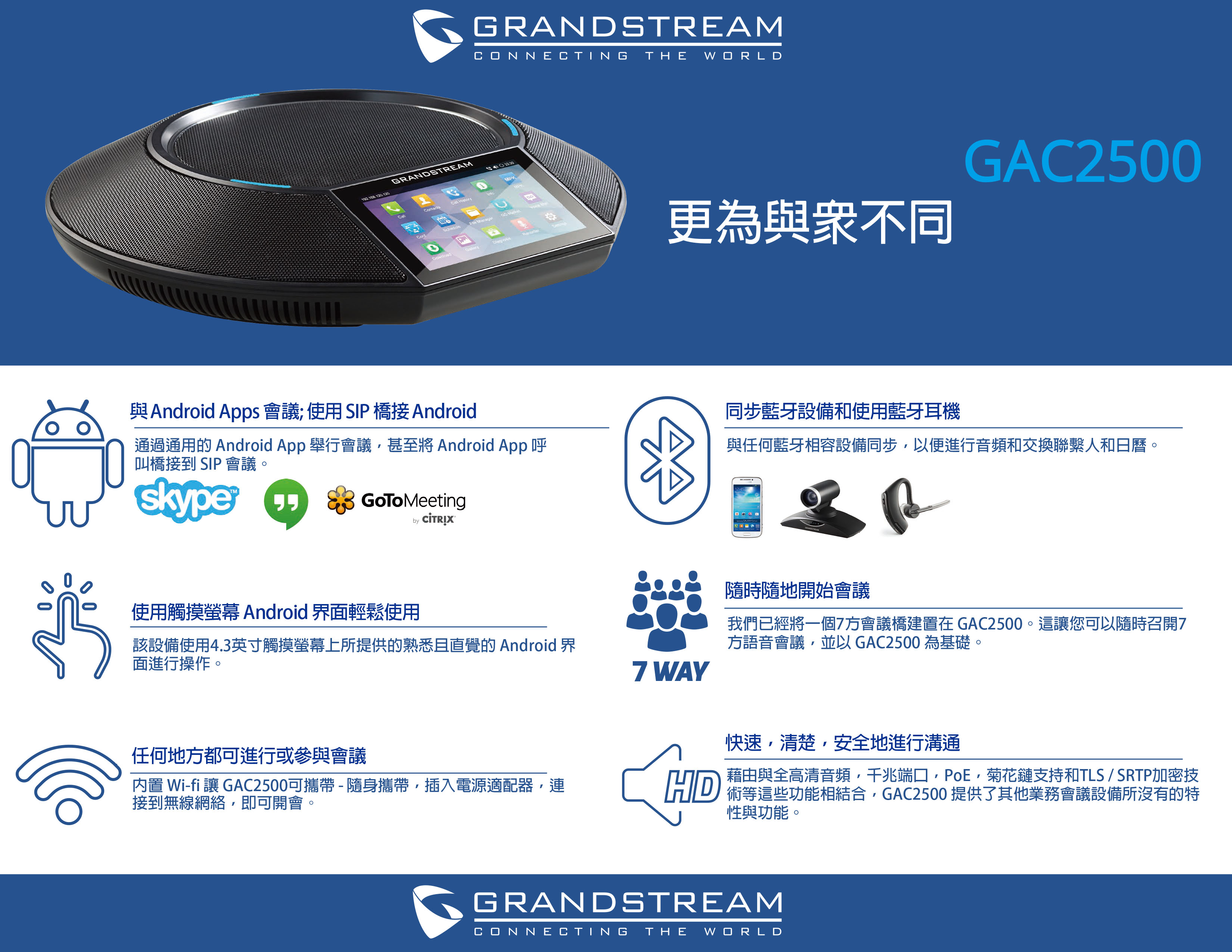 GAC2500 是一款多功能企業級高清會議電話,支援7方語音會議,內置三個麥克風和360度拾音,支持6個SIP帳號,內置4.3英寸電容觸控式螢幕,集成Wi-Fi、千兆網口、PoE+和藍牙接入。GAC2500 具備卓越的高清語音品質和先進的電話功能,可以輕鬆自動佈署及安全加密功能, 廣泛相容主流SIP/IMS/NGN平臺。GAC2500 將是企業用戶追求高性價比會議電話的最佳選擇。