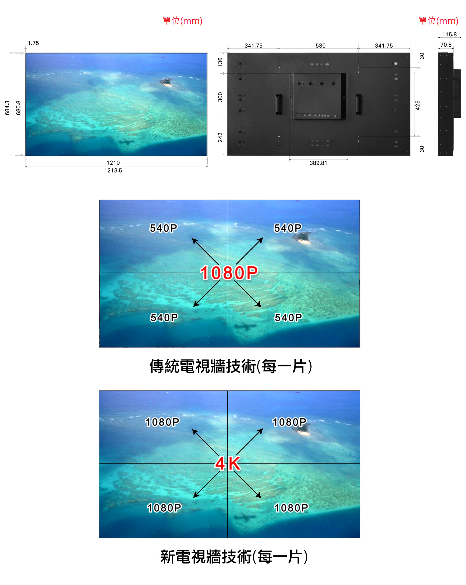 (2)電視牆面板模組支持3840*2160@30Hz 4K信號輸入,能使電視牆面板中每一片都有F-HD 1920X1080的顯示效果,強大的4K圖像處裡引擎能針對馬賽克雜訊、顆粒雜訊、斜紋干擾、雜色干擾等不同的現象採用不同的處理方式使圖像無任何壓縮拉伸讓顯示效果更清晰逼真。
