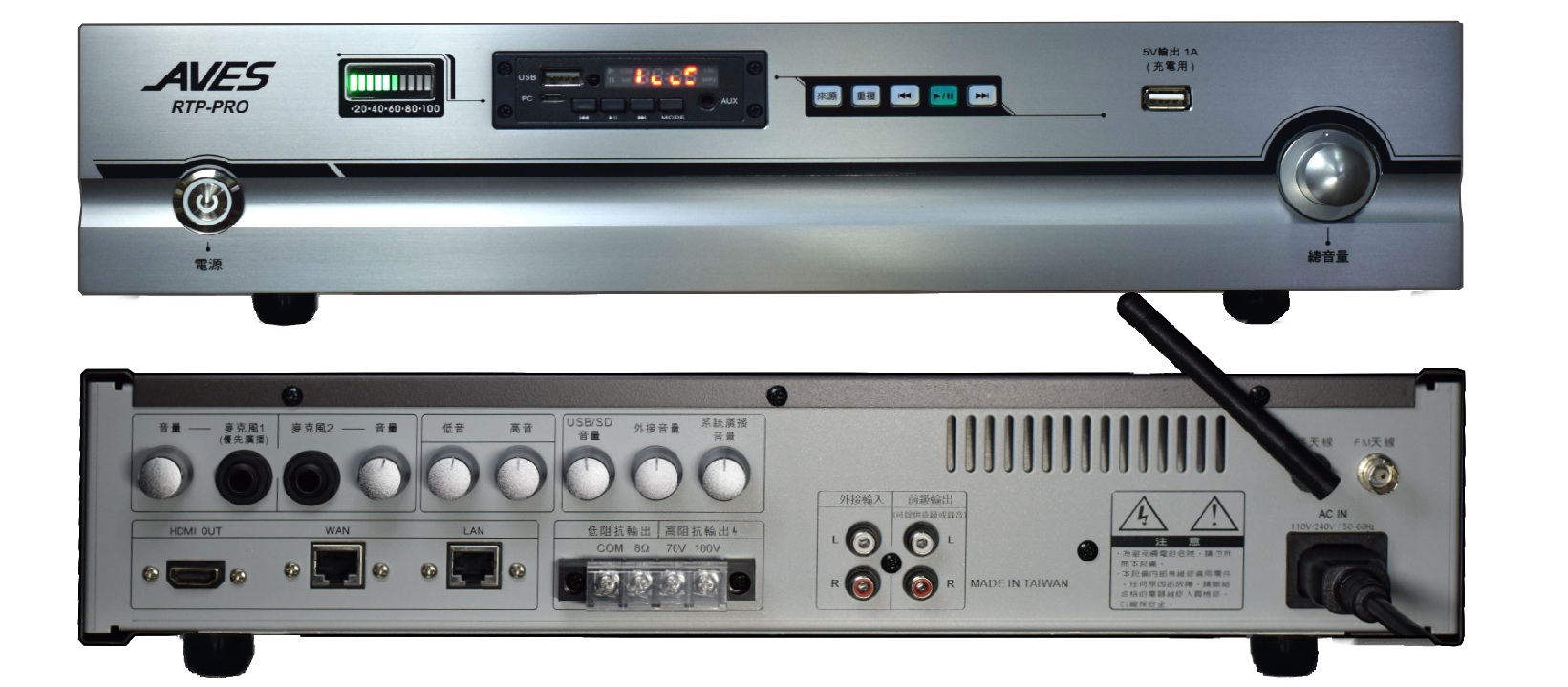 | 輸入端子 | 外接輸入 x 1組 麥克風輸入 x 2 組 ( 優先廣播×1 ) USB / SD 輸入 x 1組 |