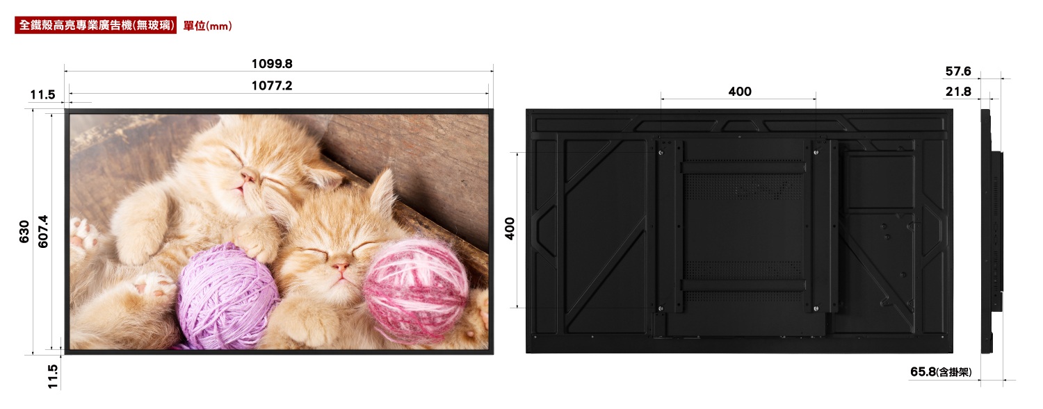 1077.2(H) x 607.4(V) mm(無玻璃款式) 1074.8(H) x 605(V) mm(內嵌玻璃款式) |